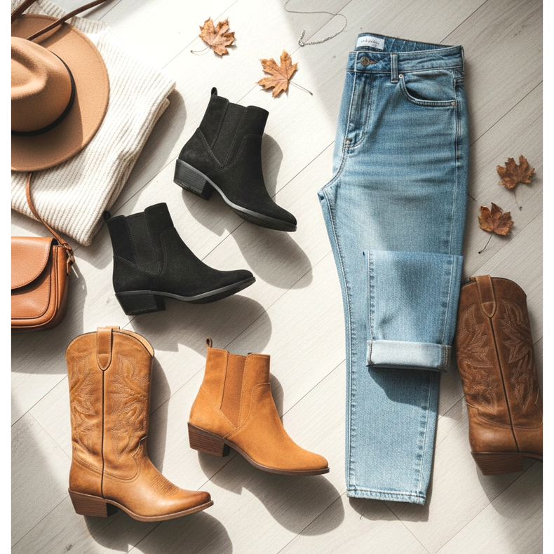 As botas cowboy, que voltam à moda em 2026, ficam fantásticas com jeans mom. Enrole as pernas até o meio da panturrilha, expondo a parte superior das botas de cowboy. Esta combinação tem um caráter retrô e ao mesmo tempo é muito atual estilisticamente.