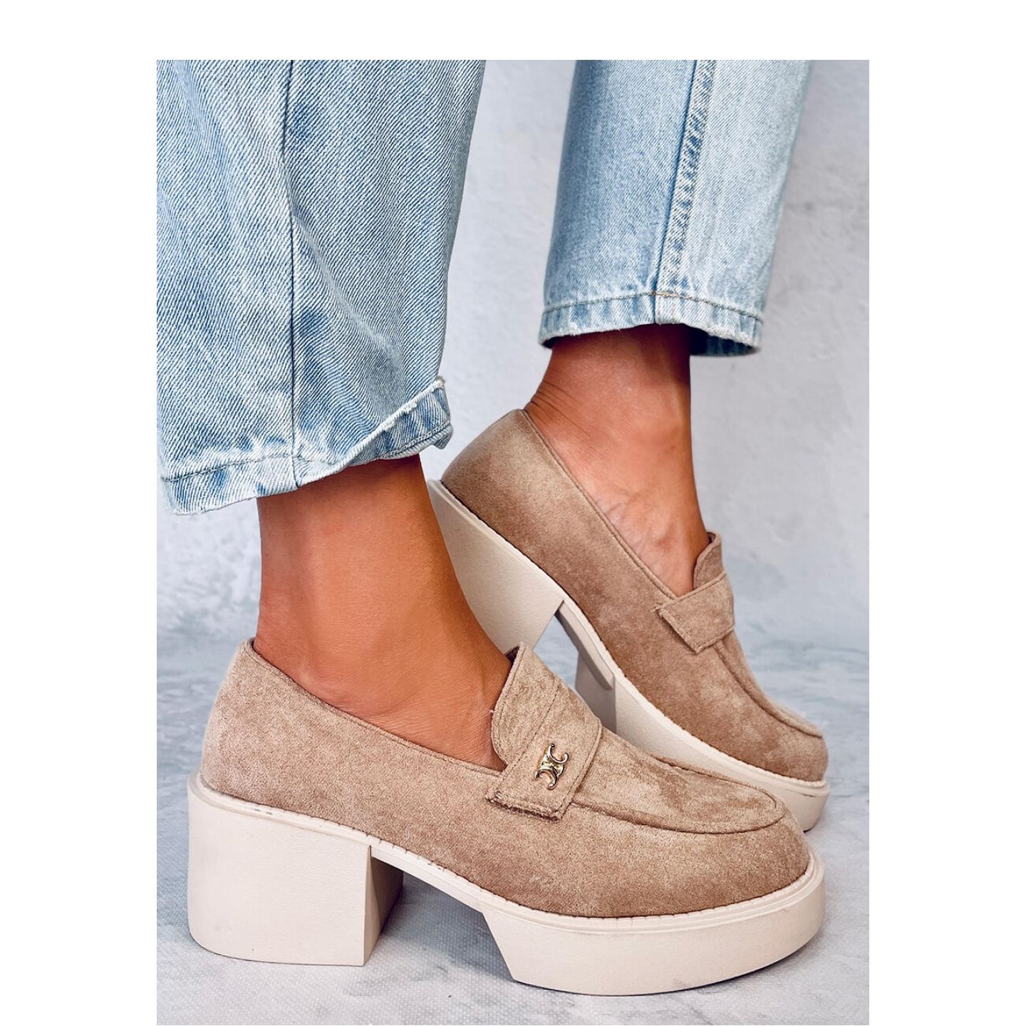 Os mocassins são feitos de camurça ecológica, que não apenas lhes dá uma aparência luxuosa, mas também é ecológica. A cor bege combina perfeitamente com várias estilizações, para que você possa usá -las diariamente e para ocasiões especiais.