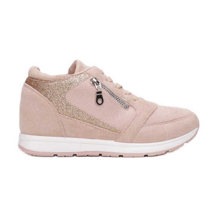Uma vantagem adicional é um zíper decorativo dourado próximo aos cadarços, além de inserções de glitter que lhes conferem um caráter único. A plataforma de 5,5 cm de altura, com sola antiderrapante, não só valoriza a figura, mas também afeta o conforto ao caminhar.