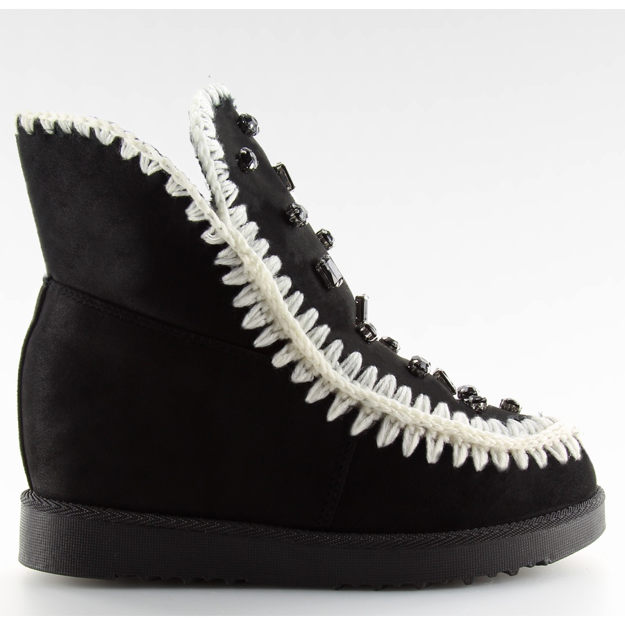 Deslumbrantes botins femininos pretos com cunha de 5,5 cm de altura que combinam um look moderno com o conforto do dia a dia. A frente é decorada com elegantes strass e o ponto decorativo de lã acrescenta personalidade e um acabamento único. A sola alta isola do frio e o interior forrado de pele garante um calor agradável nos dias mais frios.