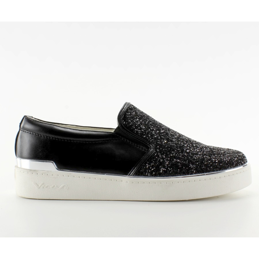 Apresentamos os modernos e elegantes slip-ons 788-26 na cor preta - a escolha perfeita para mulheres que desejam combinar conforto com elegância. Estes tênis da moda se distinguem por uma sola branca com um sutil encaixe metálico, enfatizando seu caráter elegante.