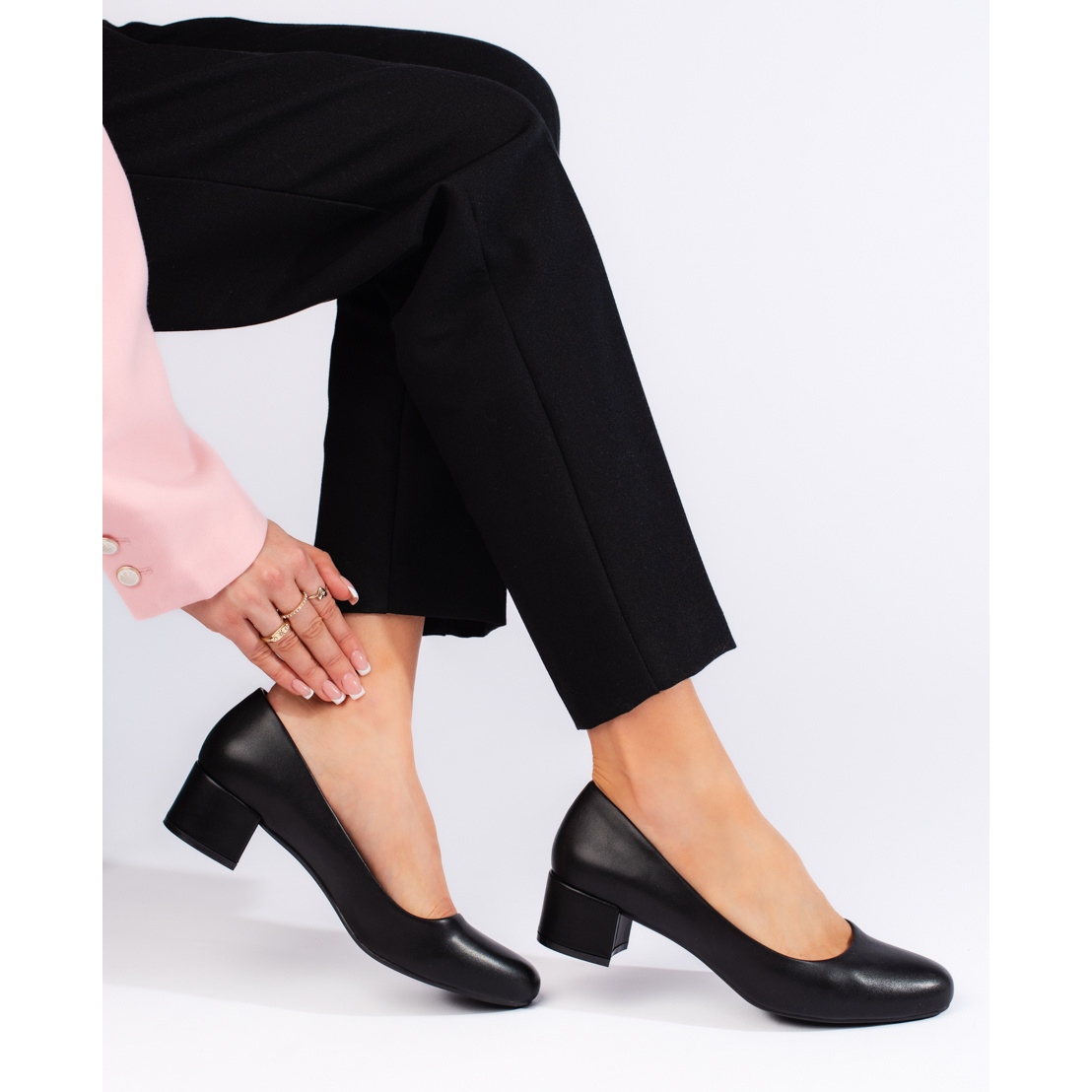 O posto baixo com uma altura de 5 cm torna esses sapatos perfeitos diariamente e em vários tipos de celebrações. Graças à sola de plástico liso, as bombas são estáveis e garantem uma certeza. Sua cor preta e universal faz com que você os componha facilmente com várias estilizações - de casual a elegante.