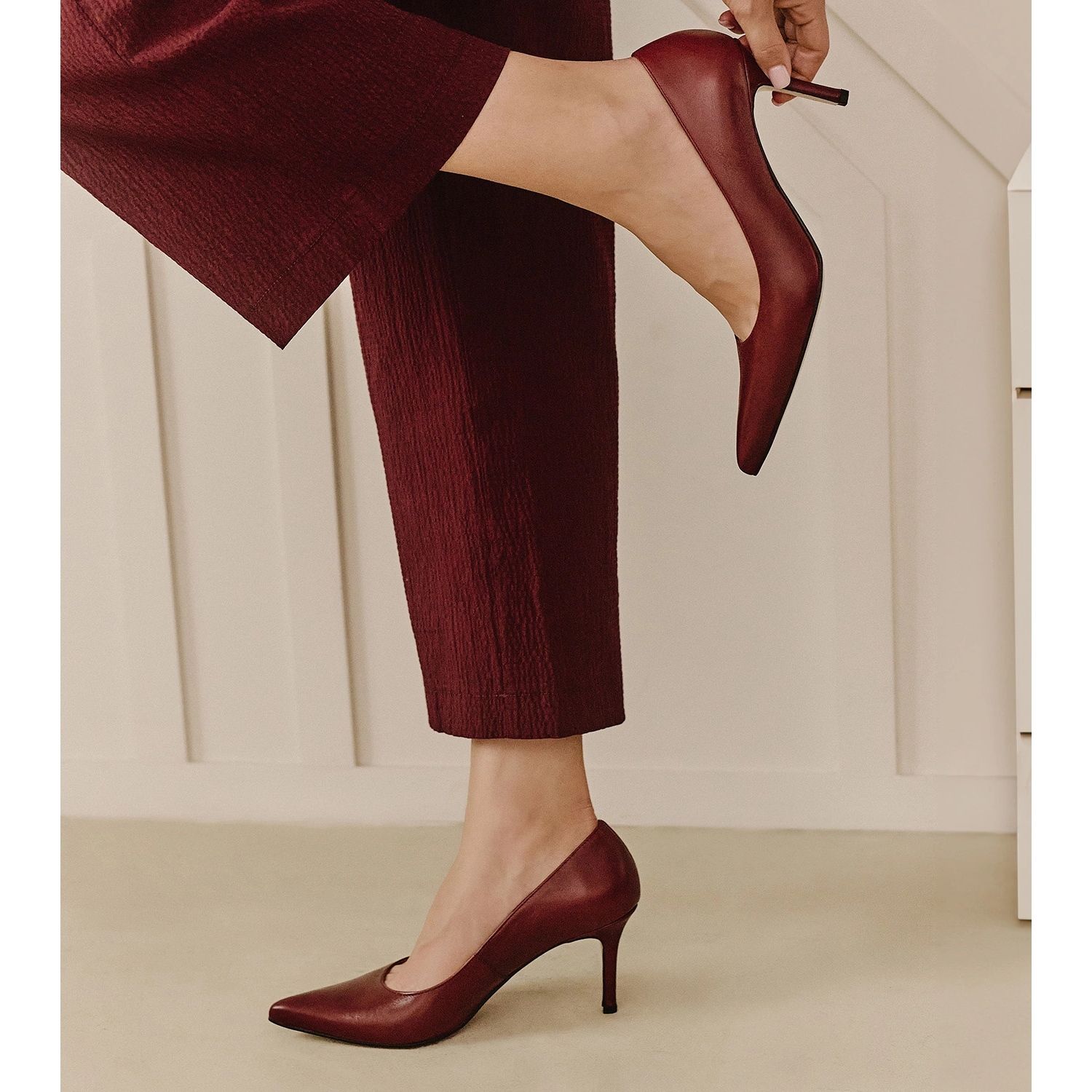 Apresente -se de classe e confiança graças a Eleve Heels em uma intensa sombra vermelha da marca Marco Shoes. Essas bombas elegantes são sapatos criados para todas as ocasiões que enfatizam perfeitamente o estilo feminino. Feitos de couro de grão natural de alta qualidade, eles garantem não apenas uma aparência atraente, mas também durabilidade e conforto do uso.