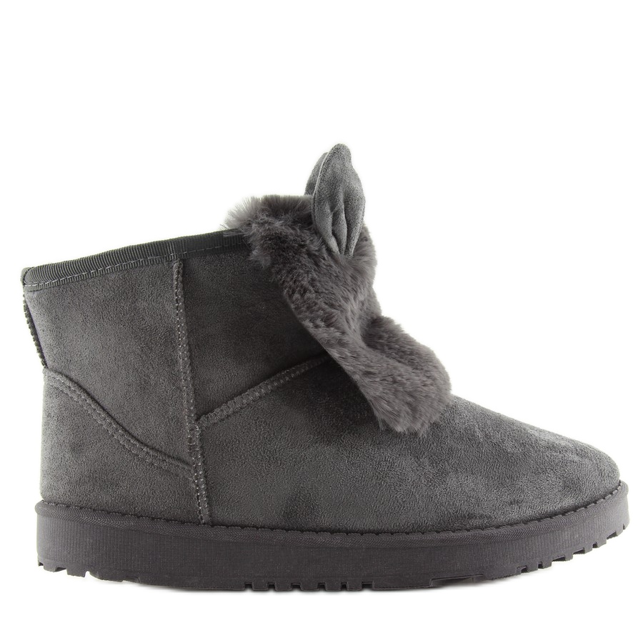 Apresentamos botas de neve femininas extremamente charmosas - emas com orelhas cinzentas, que encantam não só pela aparência, mas também pelo conforto e praticidade. Esses calçados exclusivos confeccionados em camurça ecológica são perfeitos para os dias mais frios, pois são isolados com pêlo grosso, garantindo calor e prazer de usar.