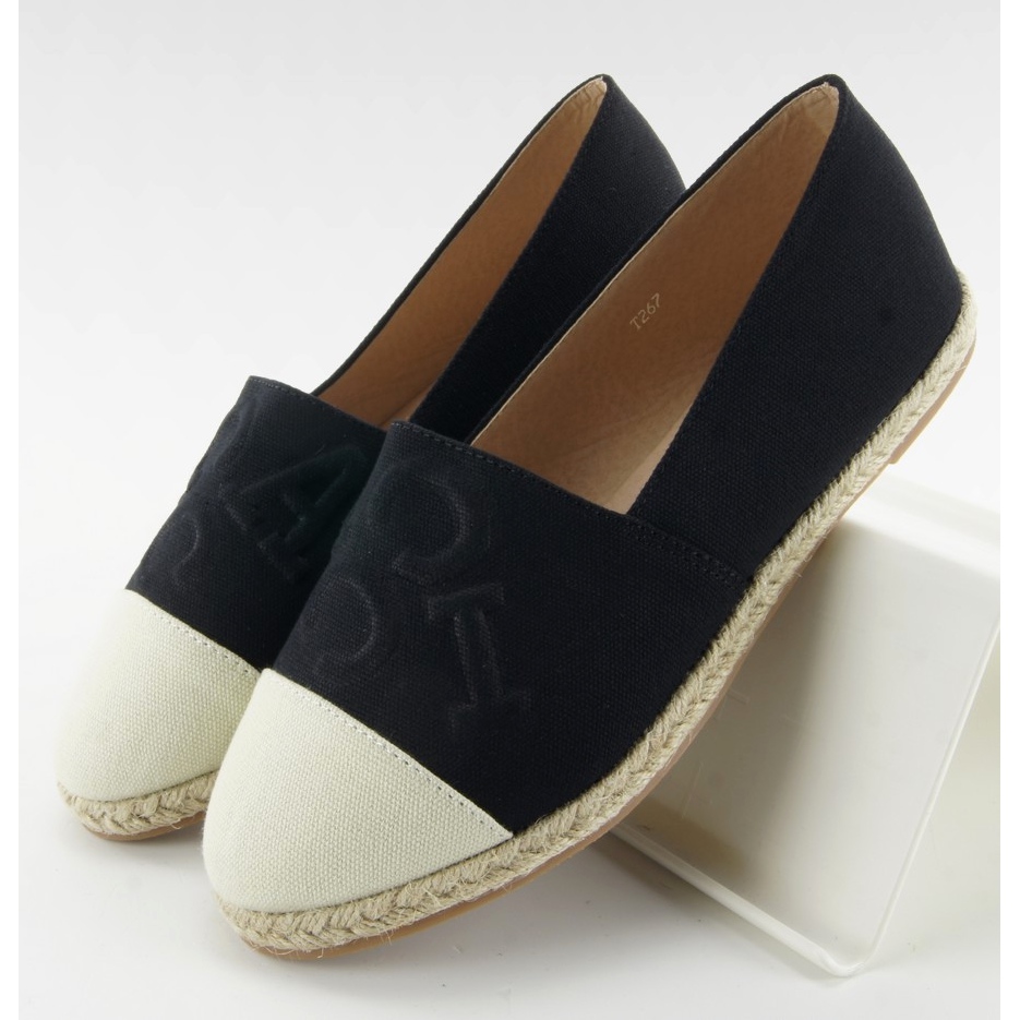 Alpercatas pretas T267 - calçado elegante, leve e confortável para o dia a dia. O corte clássico de linho é enriquecido com uma biqueira de corte contrastante e um cordão de linho na sola, que confere ao calçado um carácter natural de verão. Há relevo em forma de letras convexas na frente, o que agrega originalidade e um sutil efeito premium ao modelo.