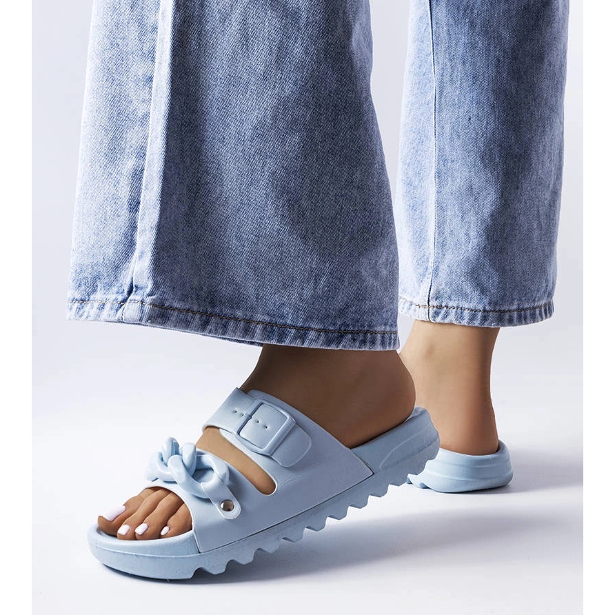 Hit de verão - chinelos confortáveis e elegantes que funcionam em estilizações casuais diárias. Feito inteiramente de borracha: as tiras flexíveis estabilizam o pé, são decoradas com fivelas decorativas e uma corrente sutil que adiciona caráter. A sola de borracha alta e 2,5 cm oferece uma aparência de amortecimento e moda, e uma superfície suave e absorvida se encaixa muitas combinações.