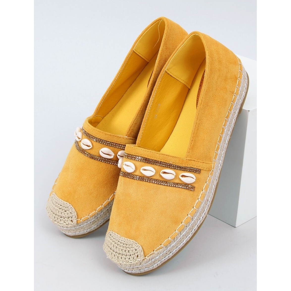Descubra as alpargatas Ocean Yellow com conchas - a escolha perfeita para mulheres que querem aliar conforto a um look fashion. Estas exclusivas alpercatas amarelas de sola alta distinguem-se por um cordão de linho trançado e uma biqueira arredondada, o que lhes confere leveza e elegância. Decorados com pedras brilhantes e lindas conchas, são um destaque perfeito para o estilo de verão.