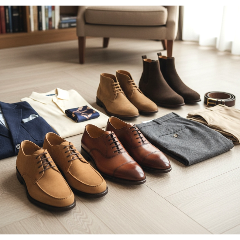 O segundo must-have são os sapatos Oxford ou Derby feitos de couro liso e polido. Oxford com renda fechada para ocasiões formais, Derby com renda aberta para o dia a dia - essa diferença sutil é o detalhe que distingue um especialista de um amador.