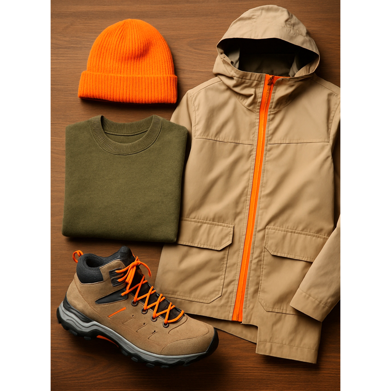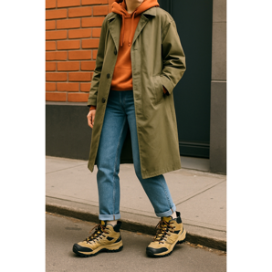 A chave para um estilo bem-sucedido é o contraste das cores. Os sapatos de caminhada costumam ter inserções de néon vibrantes. Aproveite! Se você tem sapatos com cadarços laranja, combine-os com um gorro da mesma cor ou uma capa de chuva com detalhes semelhantes. Mantenha o resto do look em tons terrosos suaves - beges, verdes e marrons, que são a essência do estilo Gorpcore.