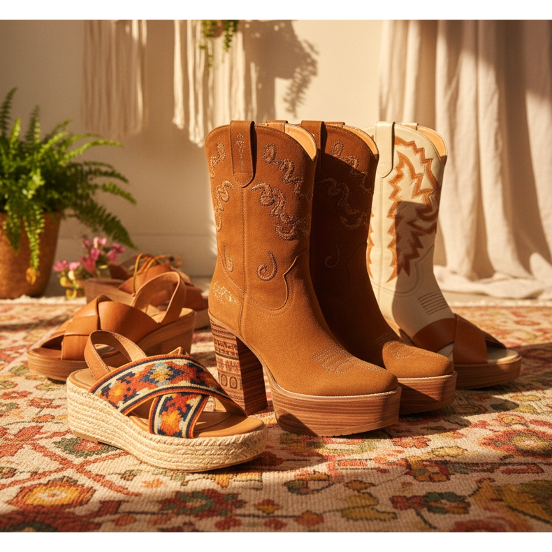 As botas de cowboy, ou seja, botas inspiradas nos calçados dos cowboys do Velho Oeste, também têm suas raízes na moda dos anos 1970. Eles são caracterizados por bico pontudo, salto inclinado e costuras decorativas. Use-os com jeans bootcut ou vestidos boho longos e esvoaçantes para um visual autêntico da época.
