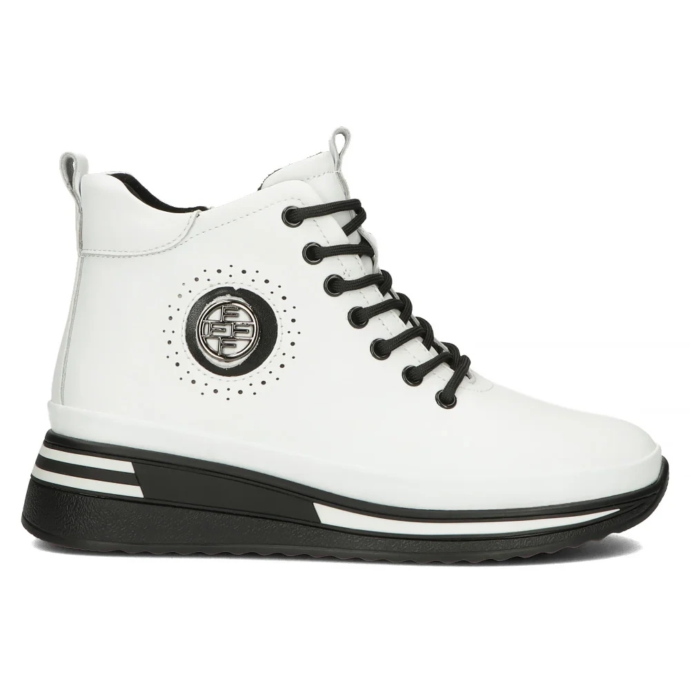 A altura da plataforma de 6 cm acrescenta sutileza e, ao mesmo tempo, aumenta opticamente as pernas, fazendo com que os pés pareçam extremamente atraentes. Branco, sem o padrão, torna as botas universais, combinando facilmente com várias estilizações, casuais e mais elegantes.