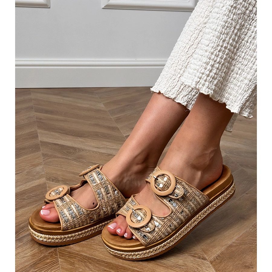 Seu bege universal, combinado com uma sola marrom, faz com que eles se misturem perfeitamente com várias estilizações - de vestidos leves a shorts curtos da moda. Um dedo redondo e uma plataforma de 4,5 cm de alta garantem o conforto de usar o dia todo, e listras trançadas decoradas com lantejoulas dão a eles um personagem e brilho únicos.