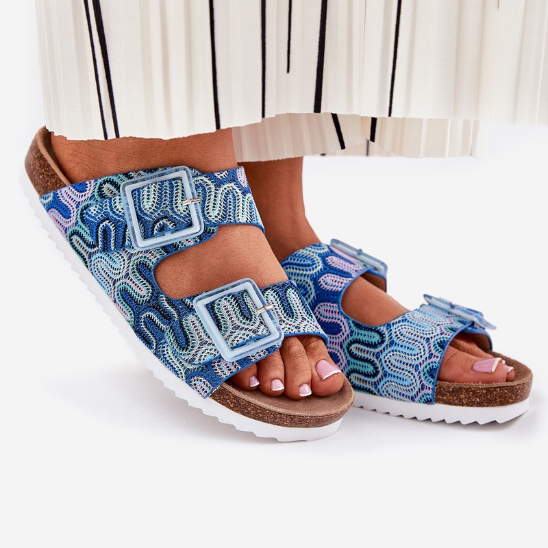 Aqui estão os chinelos perfeitos para os chinelos dos dias de verão, com fivelas e brilho S. Barski RB51-006 em azul. Feito de material têxtil de alta qualidade, esses chinelos estampados são colocados em uma plataforma de cortiça confortável com uma altura de 3 cm, o que os torna não apenas elegante, mas também muito confortável.