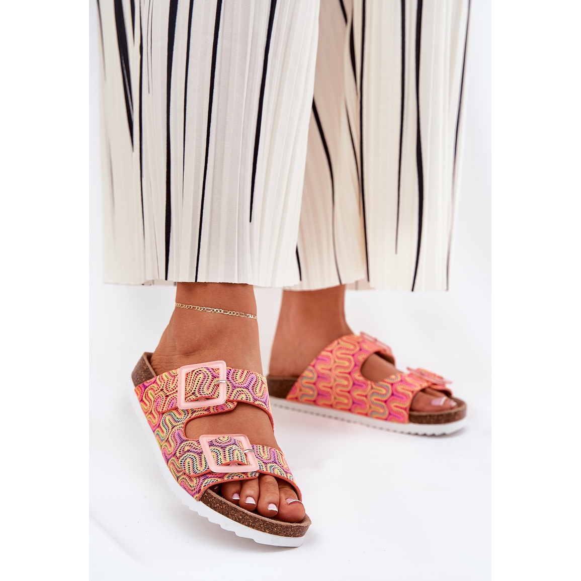 Os chinelos femininos com fivelas e glitter S. Barski RB51-006 em Orange é uma ótima opção para todas as mulheres da moda que valorizam o conforto combinado com o estilo original. Feito de material têxtil de alta qualidade, esses retalhos estampados são incorporados em uma plataforma de cortiça estável com uma altura de 3 cm, o que garante o conforto de usar o dia todo.