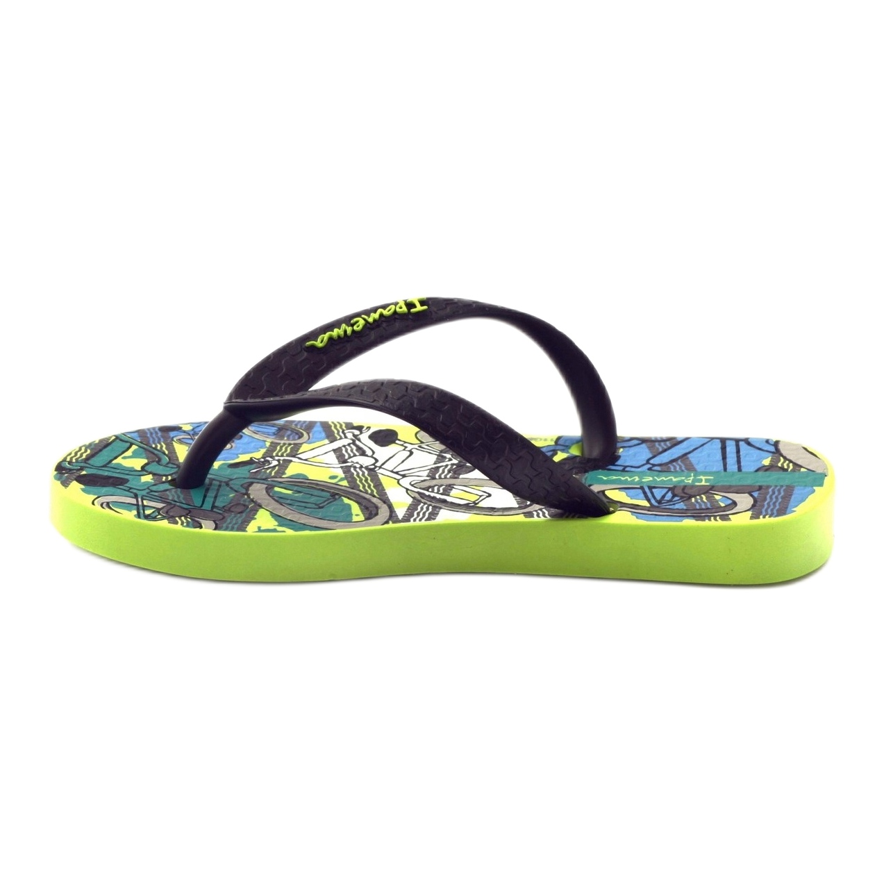 Os chinelos Ipanema 81713 caracterizam-se por uma elegante cor preta que, combinada com uma sola verde brilhante, cria um design original e moderno. A parte interna do calçado é decorada com um interessante motivo de ciclismo, que lhe confere um carácter jovem. Estes chinelos não são apenas funcionais, mas também elegantes, perfeitos para meninos e meninas. Graças às tiras fortes e grossas que seguram firmemente o pé, as crianças podem correr e saltar livremente.