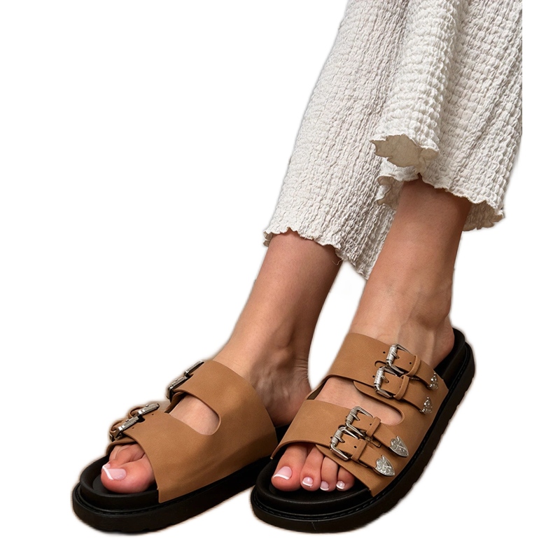 Aqui estão os chinelos de mulheres marrons com fivelas decorativas em uma sombra bege - a escolha perfeita para dias de verão e saídas diárias. Esses chinelos elegantes combinam conforto e design da moda, graças aos quais são uma excelente adição a qualquer estilização.