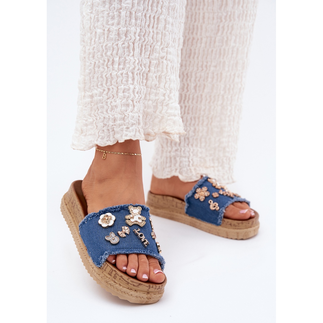 Chinelos femininos com pinos dourados na plataforma azul marinho