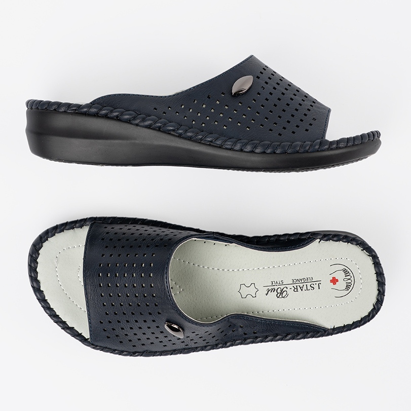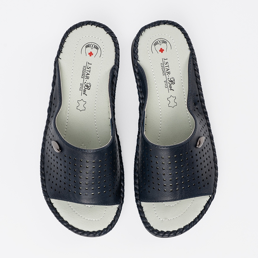 Apresentamos os chinelos femininos azuis da Marinha com uma inserção de couro, que é uma combinação ideal de estilo, conforto e alta qualidade. Esses chinelos deslizantes de uma marca respeitável se tornam uma ótima opção para os dias de verão e passeios diários. Graças ao salto plano com uma altura de 3,5 cm, eles são extremamente confortáveis, mesmo durante o desgaste a longo prazo.