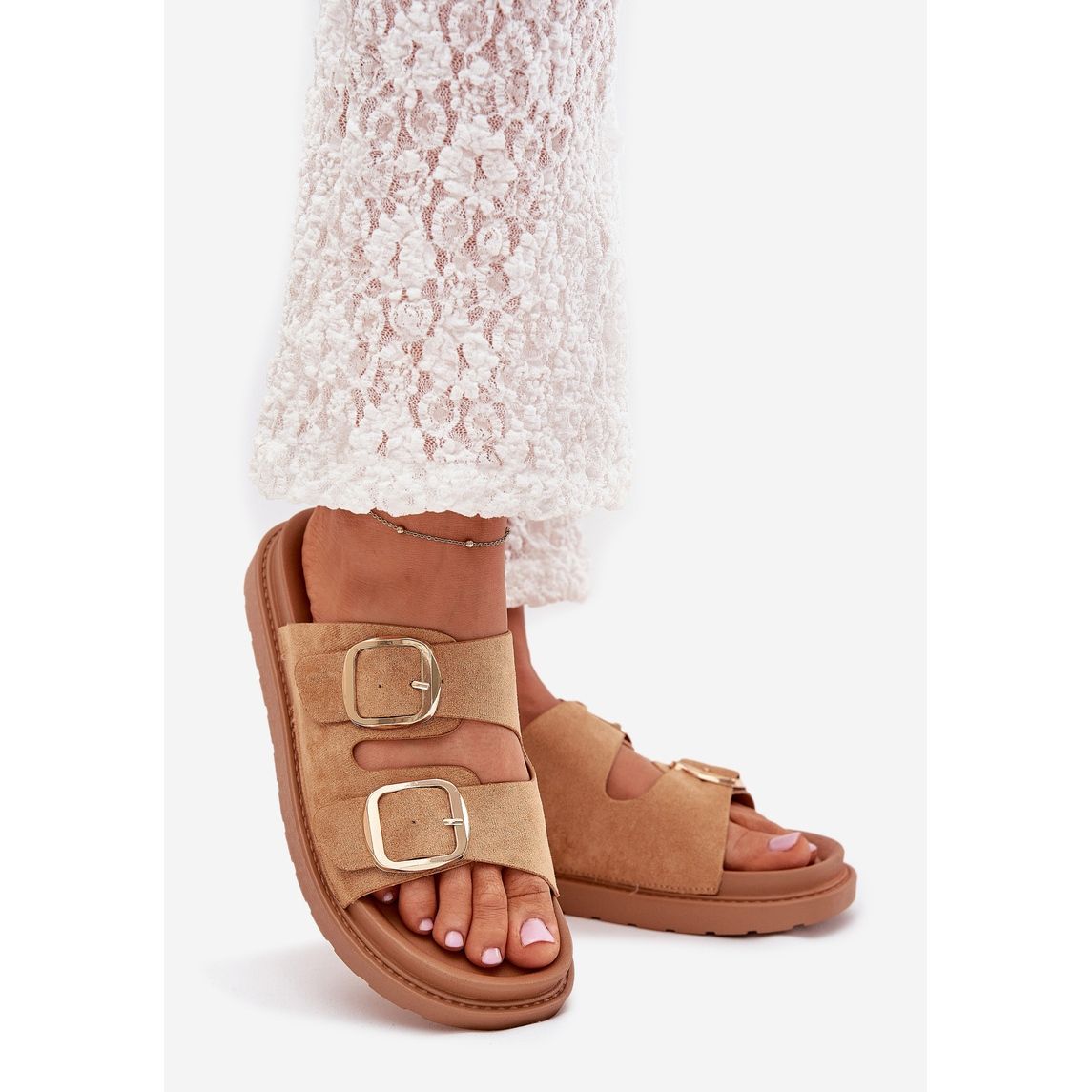 Apresentamos os chinelos femininos femininos femininos na plataforma com camelo marrom dourado veren fivelas-a escolha perfeita para os dias de primavera-verão! Feito de camurça ecológica de alta qualidade, esses chinelos elegantes combinam elegância e conforto. Situados em uma plataforma de 3,5 cm de alta, eles fornecem um ótimo suporte a pé, o que os torna perfeitos para saídas diárias.