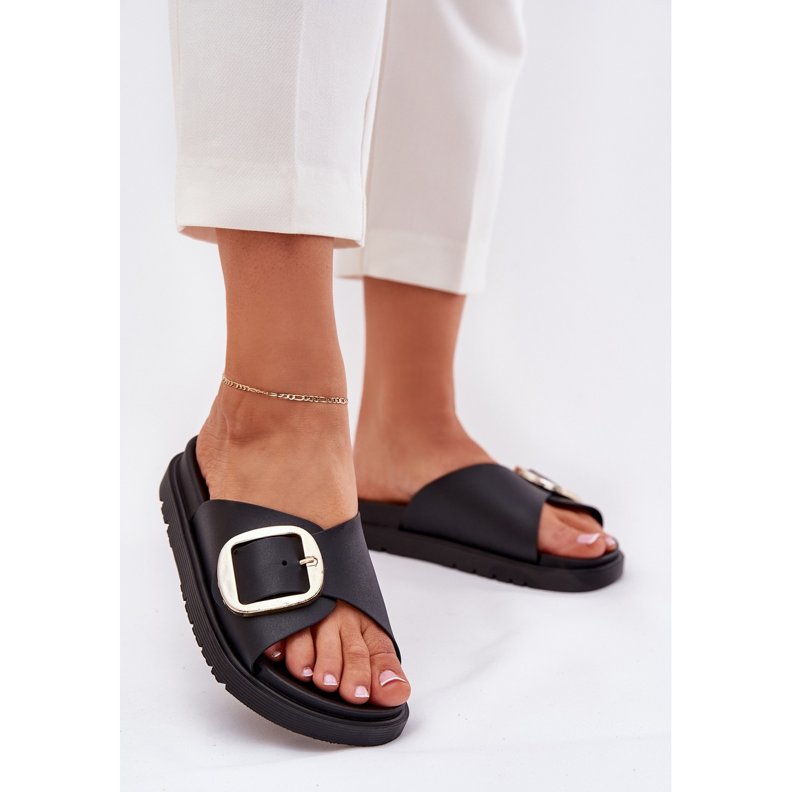 Sua plataforma de 3 cm de alta garante estabilidade e conforto, e um grande grampo dourado adiciona elegância e caráter único. Graças às cores pretas moderadas, os flip -flops são fáceis de combinar com estilos diferentes - de roupas diárias a combinações mais elegantes.