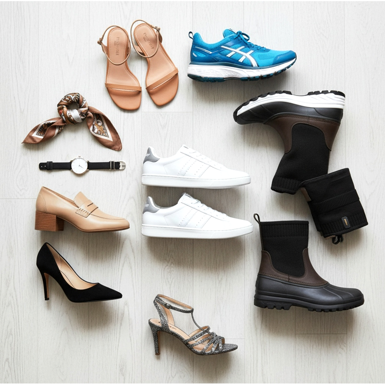 Lembre-se também do clima em que você vive. Uma mulher que mora em uma cidade litorânea precisará de sapatos diferentes de uma mulher que mora em uma região montanhosa. Leve em consideração a sazonalidade e as condições climáticas típicas da sua localização.