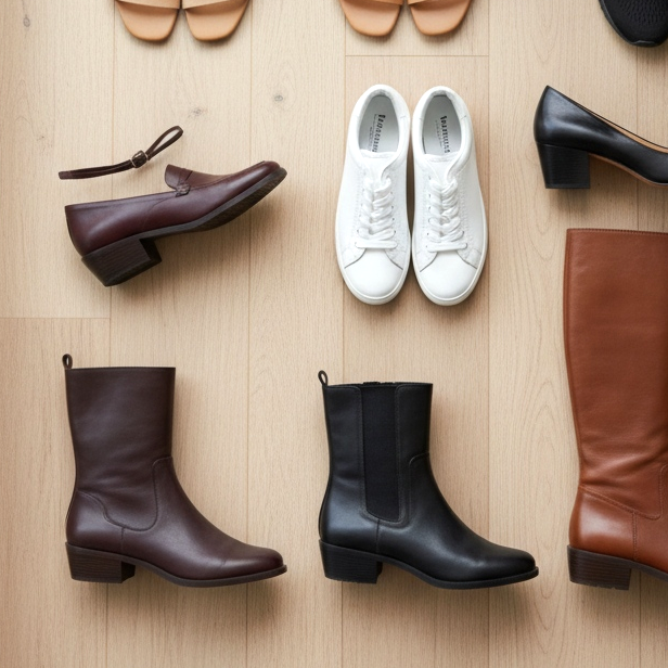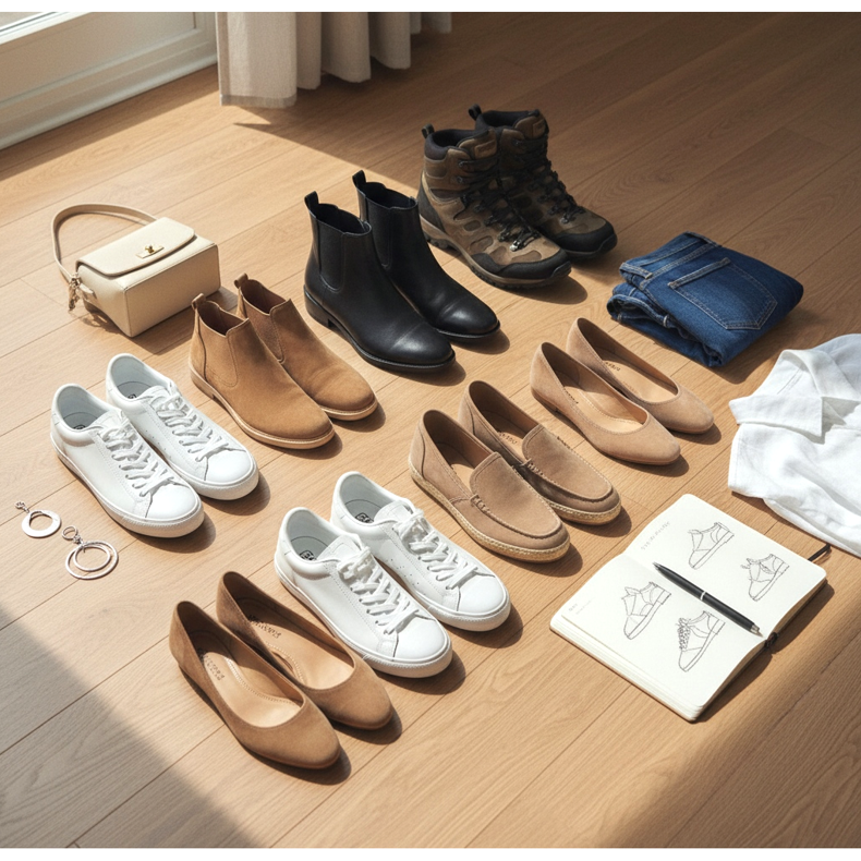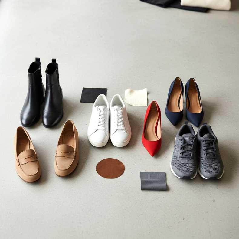 Opcional: calçados esportivos para exercícios, saltos altos elegantes para ocasiões especiais, botas de chuva confortáveis para dias de chuva.