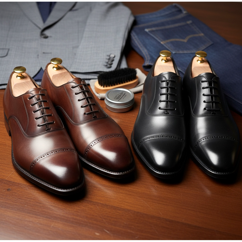 Os Oxfords, com seu característico laço fechado, são um pouco mais formais e combinam perfeitamente com um terno. Os sapatos Derby, com cadarço aberto, são mais versáteis e podem ser usados tanto com terno quanto com jeans escuro e camisa.