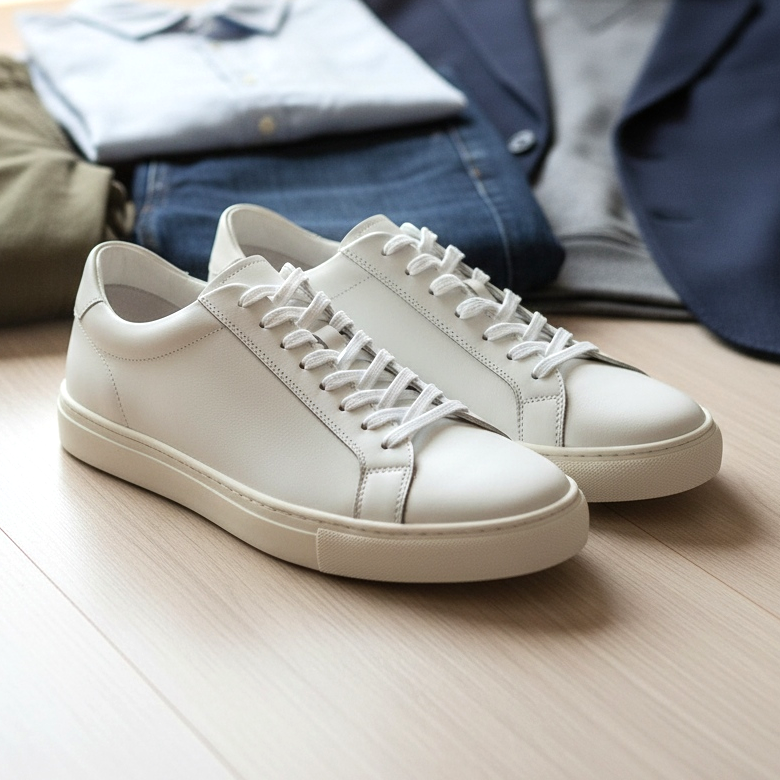 O tênis branco é um must-have absoluto para o homem moderno. São tão versáteis que pode usá-los com calças de ganga e camisa, jeans e sweatshirt, ou até com um casaco leve num estilo smart casual.