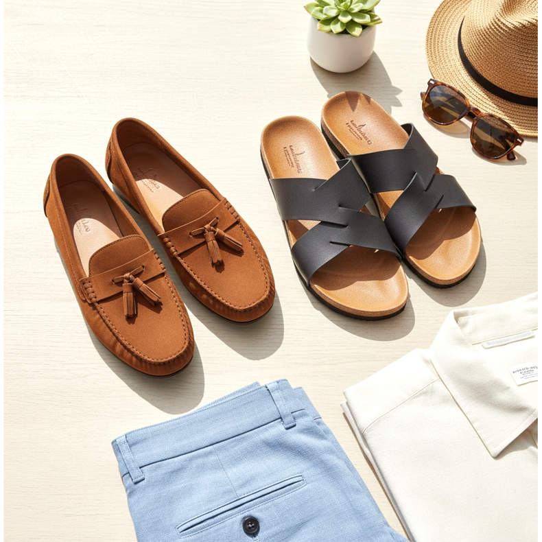 Par 4: Mocassins ou mocassins e Par 5: Sandálias ou chinelos de couro