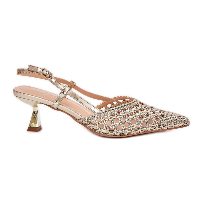 Apresentamos saltos altos elegantes com o nariz pontudo e um salto aberto em uma cor dourada fenomenal, que complementará perfeitamente todas as estilização noturnas. Esse modelo único, preso com uma fivela, fornece um ajuste perfeito para o pé, o que garante não apenas conforto, mas também confiança a cada passo.