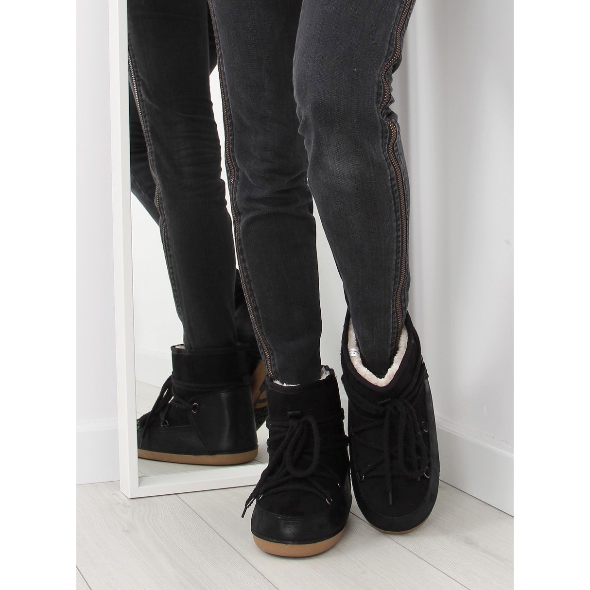O interior das botas de neve é forrado com pêlo grosso, o que garante ótimo calor e conforto no uso. O conforto de uso também é melhorado pela capacidade de ajustar a parte superior - graças ao cordão, você pode ajustar facilmente a largura do calçado às suas necessidades.