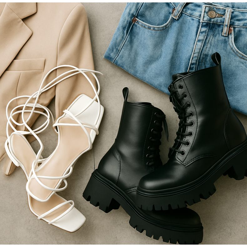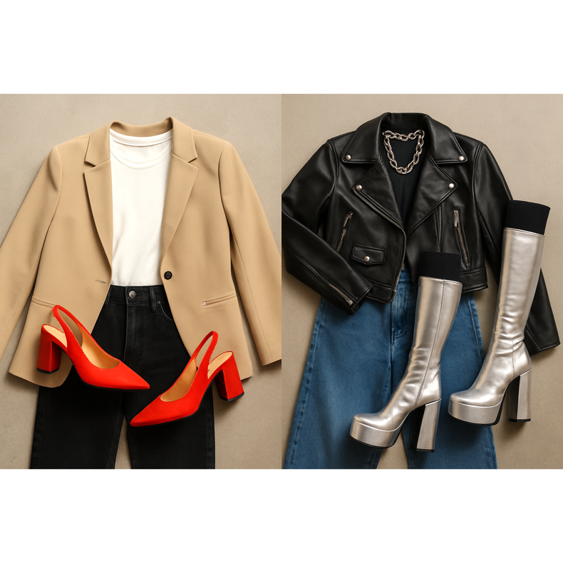 • Acessórios em negrito: Calçados com correntes, pregos, formas incomuns