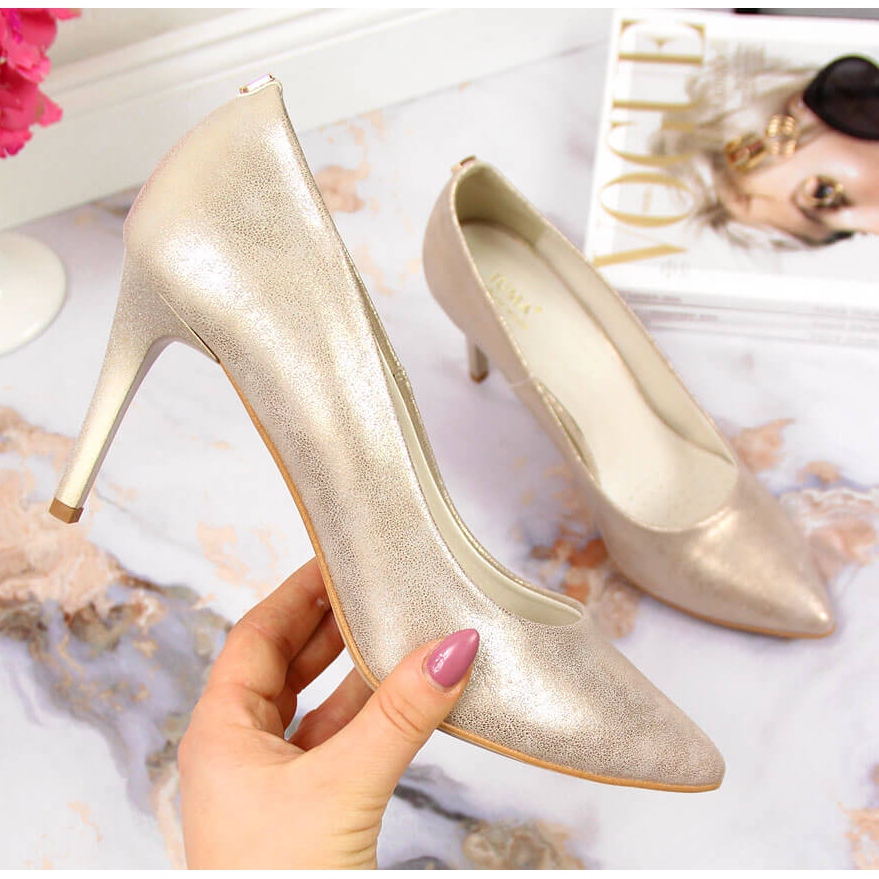 Descubra os exclusivos saltos altos dourados brilhantes da renomada marca polonesa Juma! Estas bombas extremamente modernas são o complemento perfeito para estilos elegantes e sofisticados. A sua superfície dourada brilhante chama a atenção e a palmilha inovadora e extremamente macia torna o uso mesmo por muitas horas um puro prazer.