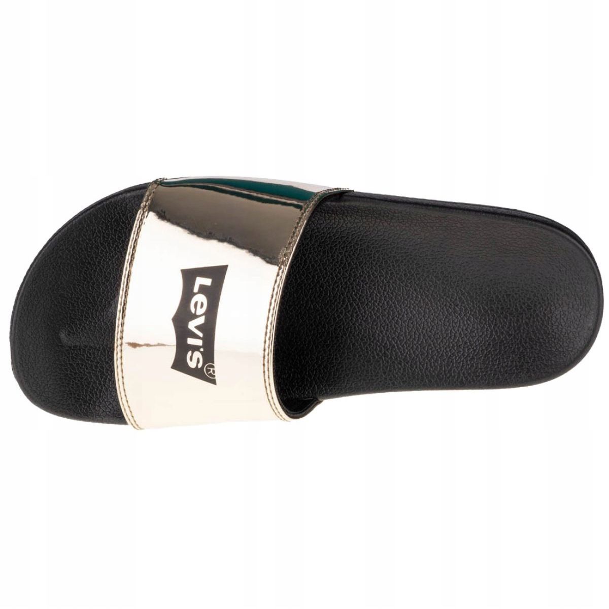 Os chinelos Levi's June Batwing SW 229170-755-04 37 são calçados femininos elegantes e confortáveis, perfeitos para os meses de verão. Seu estilo combina a clássica cor preta com atraentes detalhes dourados, o que os torna não apenas uma escolha prática para os dias quentes, mas também uma adição moderna ao estilo de verão.
