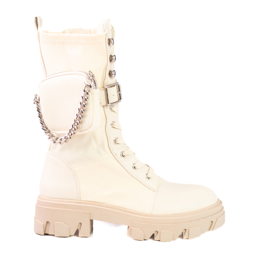 A cor bege e o design minimalista fazem com que estes botins combinem perfeitamente com uma variedade de estilos - do casual ao mais elegante. O fecho de correr, fivela e atacador permitem um ajuste perfeito ao pé, e o elemento adicional em forma de corrente confere-lhes um carácter original.