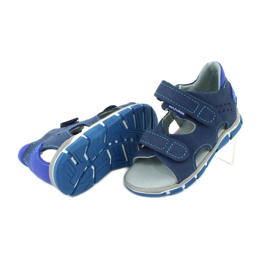 As sandálias Mazurek 314 com velcro nas cores azul marinho e azul são a escolha perfeita para meninos ativos que valorizam conforto e estilo. Estas sandálias cuidadosamente desenhadas são confeccionadas inteiramente em couro natural de alta qualidade, o que garante durabilidade e respirabilidade, necessárias nos dias quentes.
