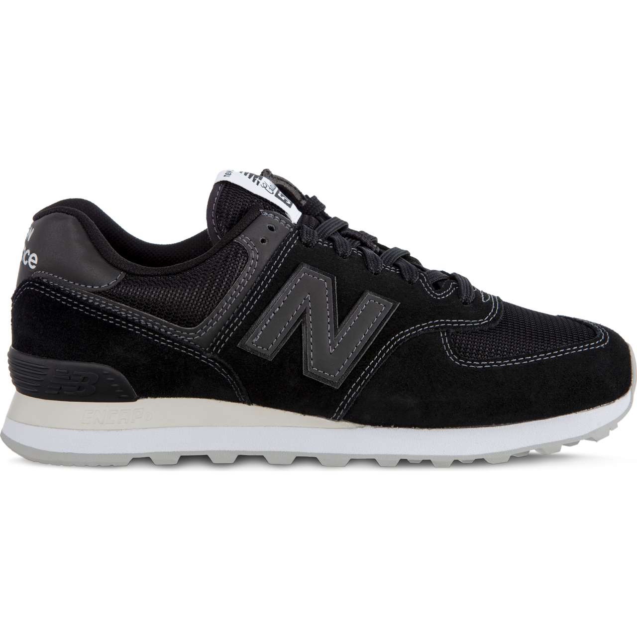 New Balance ML574ETA Preto - tênis masculino clássico que combina design atemporal com conforto no dia a dia. Sapatos baixos pretos com parte superior em camurça com inserções de malha arejada proporcionam um visual elegante e ao mesmo tempo esportivo que funciona bem tanto em estilos urbanos quanto em ocasiões casuais.