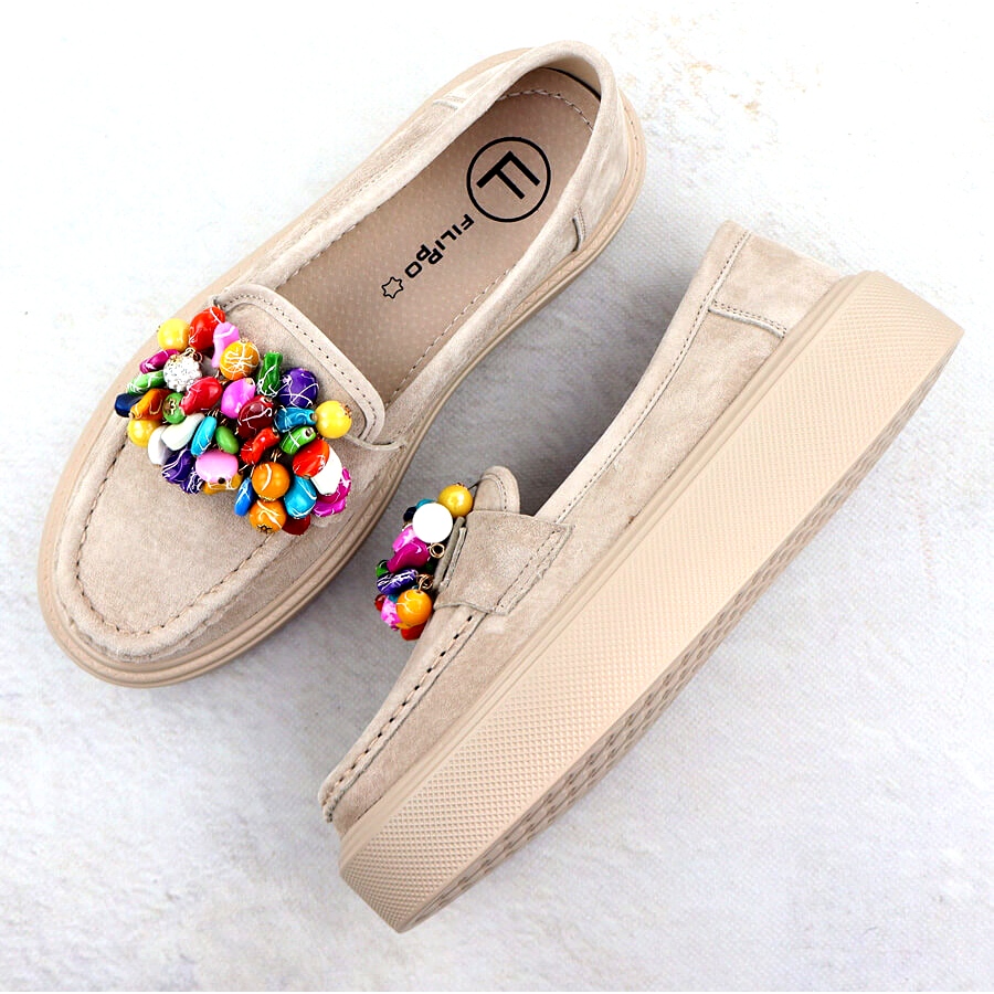 Os mocassins de couro em uma plataforma com bege bege filippo dp6765 é uma ótima proposta para mulheres que desejam combinar conforto com uma aparência elegante. Feito de couro de camurça natural da mais alta qualidade, esses sapatos não apenas parecem elegantes, mas também são duráveis e confortáveis.