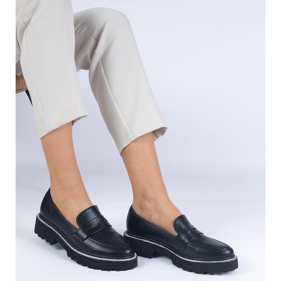 Os mocassins pretos são perfeitos para todos os dias e para ocasiões mais formais, enfatizando o caráter único de qualquer estilização. A sola leve e flexível feita de plástico significa que o uso de conforto dura o dia todo.