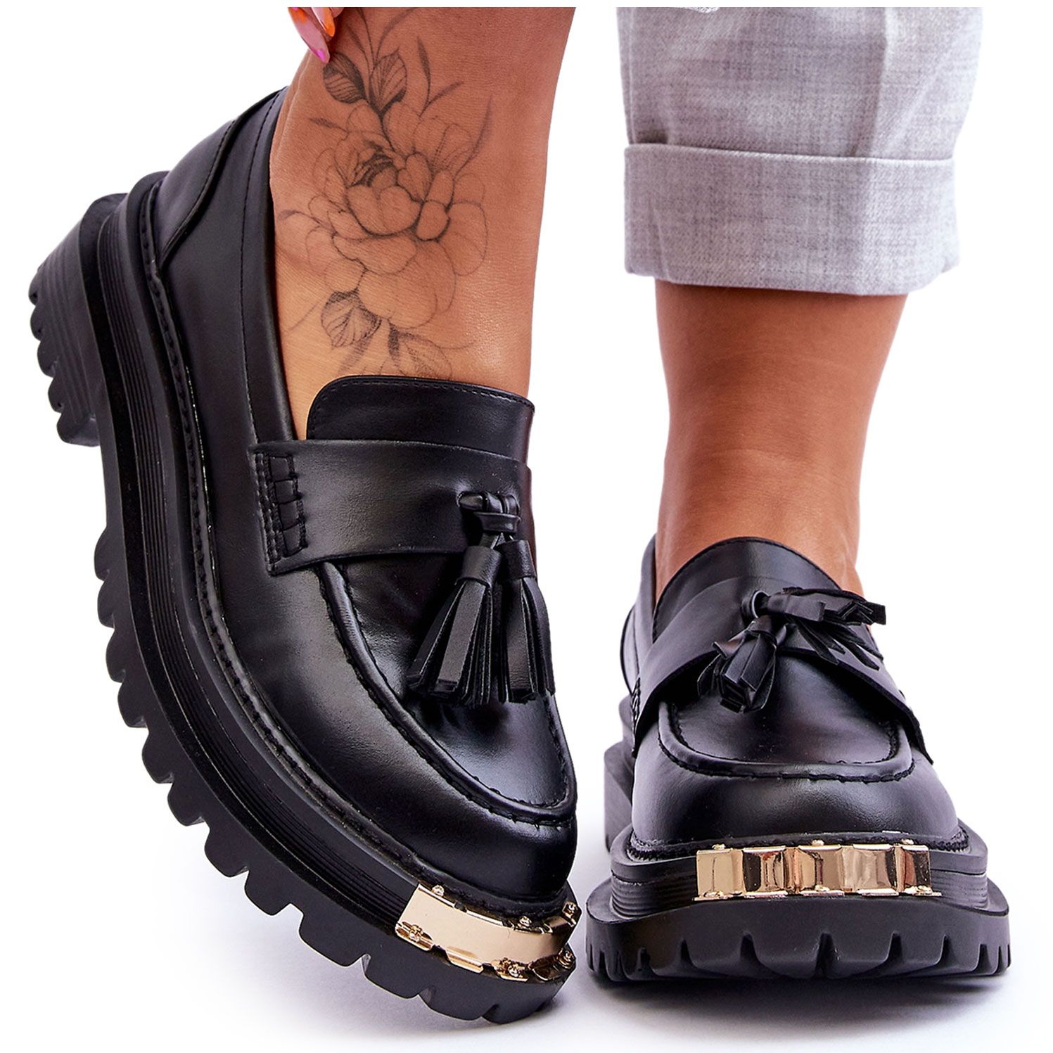 Os mocassins elegantes e pretos feitos de couro ecológico são uma proposta que combina conforto com detalhes da moda. Na frente, há uma decoração sutil e dourada e, no meio das franjas elegantes superiores, que adicionam caráter e leveza. O modelo está definido em uma plataforma estável de 4,5 cm de altura com um salto plano, o que garante o conforto de usar o dia todo.