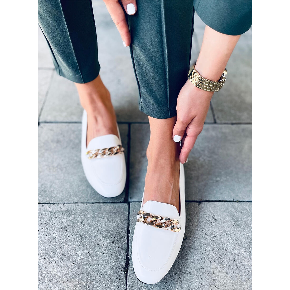 Os mocassins de corrente Addison White são a escolha perfeita para mulheres que desejam combinar elegância com conforto no dia a dia. Estes sapatos confeccionados em couro ecológico de alta qualidade distinguem-se pelo seu design atemporal, enriquecido com um toque de moda na forma de uma corrente estilosa.
