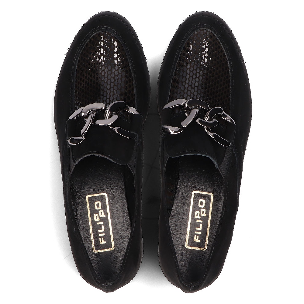 São elegantes e confortáveis mocassins de couro Filippo 124 na cor preta, que são a escolha perfeita para mulheres que valorizam conforto e estilo. Estes sapatos da moda vão dar um toque de luxo a qualquer estilo graças à decoração em corrente, que atrai o olhar e lhes confere um carácter único.