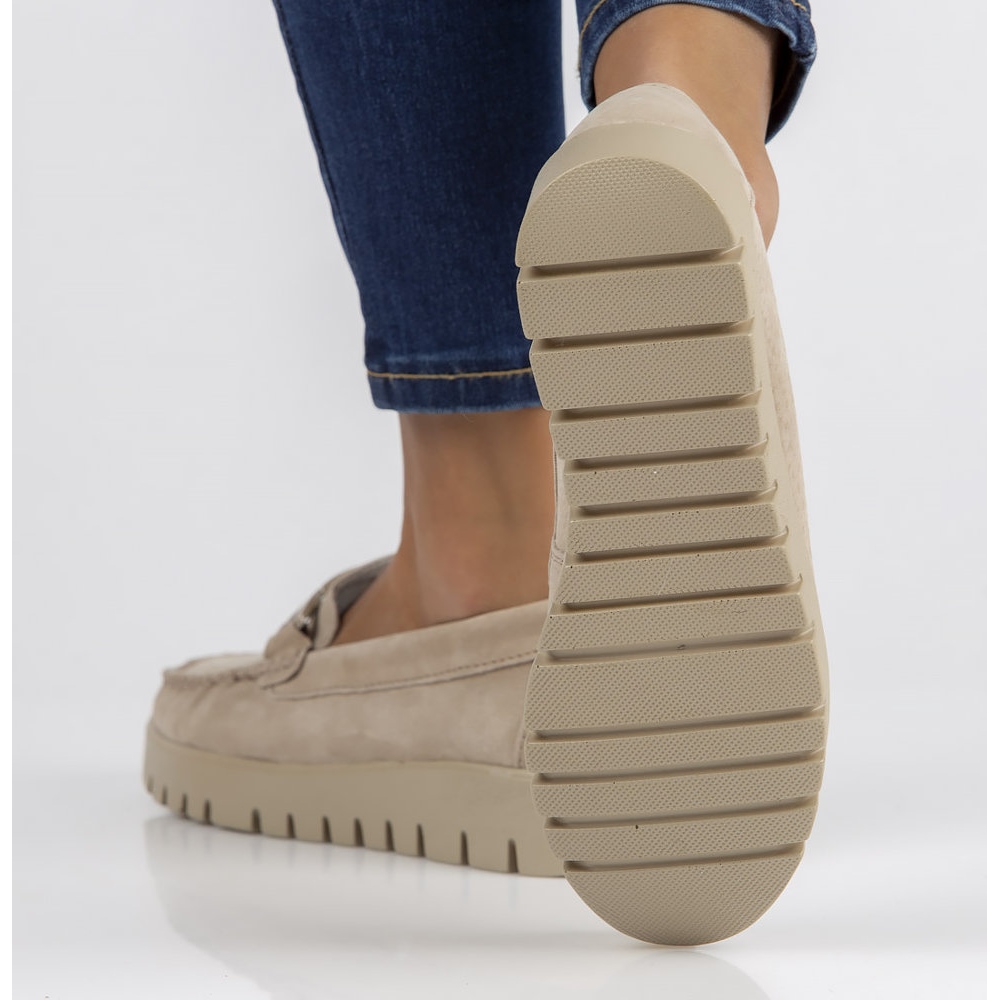 Graças ao salto plano e à altura da plataforma de 2 cm, estes mocassins são a solução ideal para os passeios do dia a dia. O nariz redondo e o fecho deslizante tornam a colocação rápida e conveniente. Além disso, a sua cor bege universal combina perfeitamente com vários estilos, tanto casuais como mais elegantes.