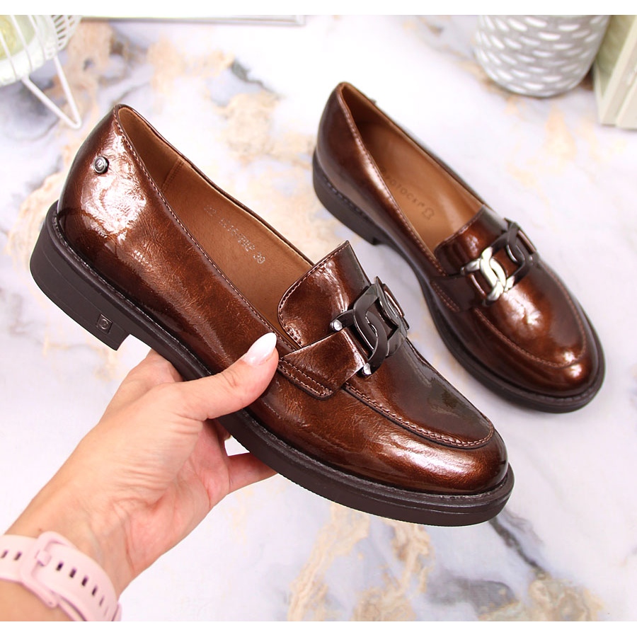 Descubra a elegância e o conforto oferecidos pelos mocassins femininos lacados de salto alto castanhos da conceituada marca Potocki. Estes sapatos da moda são a escolha perfeita para mulheres que valorizam estilo e conforto no uso diário.