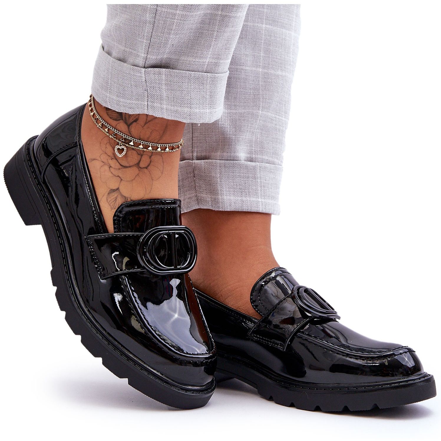 Apresentamos calçado elegante e confortável para a mulher moderna - Mocassins de Couro Envernizado PG1 em Plataforma, Black Jarren. Estes sapatos elegantes combinam as características clássicas dos mocassins com um design moderno e são o complemento perfeito para um guarda-roupa diversificado.