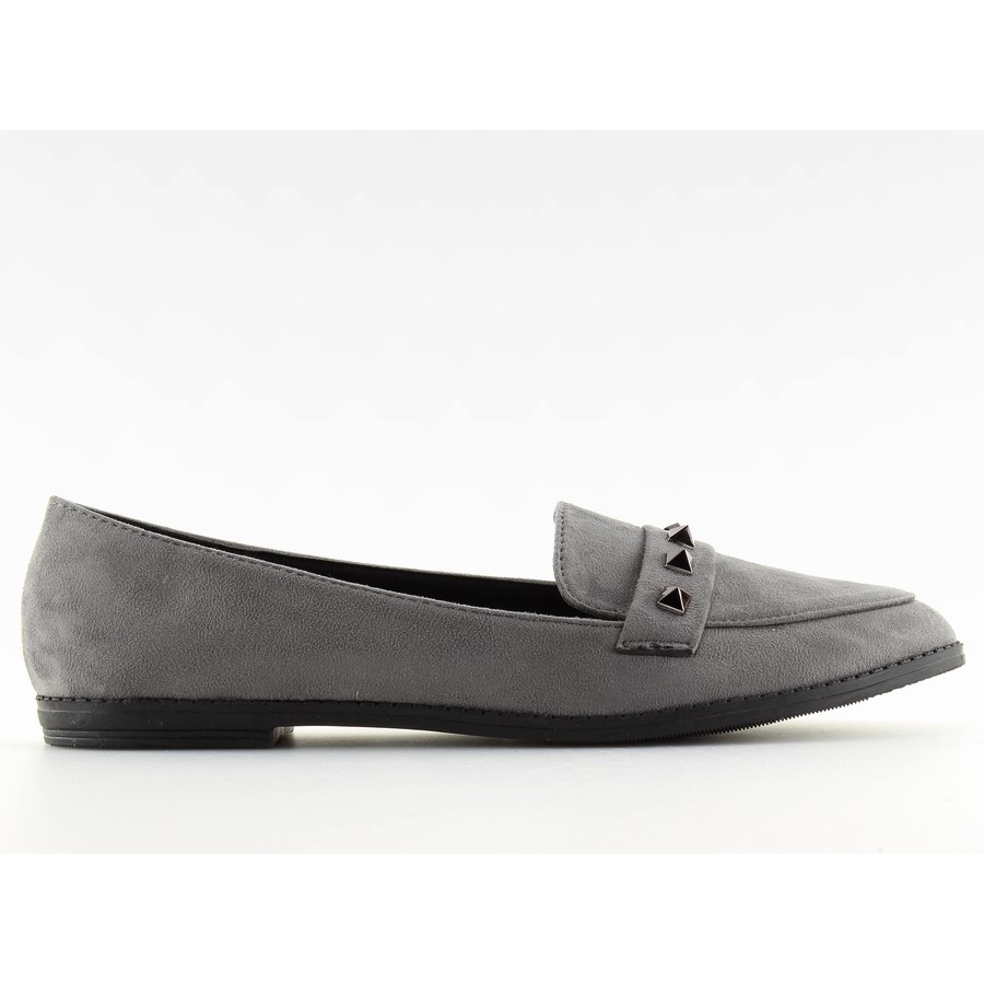 Mocassins femininos elegantes e cinza com tachas - perfeitos para estações de transição. Confeccionados em camurça ecológica, realçam a linha esbelta do pé, e a faixa decorativa no peito do pé com tachas metálicas confere-lhes um carácter distintivo. A clássica biqueira arredondada e o salto baixo (1 cm) garantem conforto no dia a dia, e o design slip-on facilita a colocação rápida.