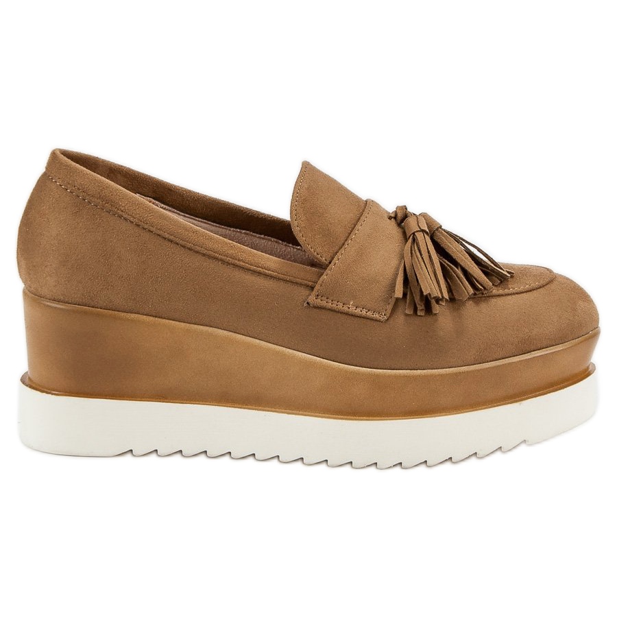 Descubra os exclusivos mocassins Corina Brown Camel Wedge, que são a combinação perfeita de estilo e conforto. Estes elegantes sapatos femininos são confeccionados em couro camurça sintético ecológico, que além de imitar perfeitamente o couro natural, também é ecologicamente correto. O interior dos mocassins é forrado com pele ecológica, o que torna cada momento passado com este calçado um puro prazer.