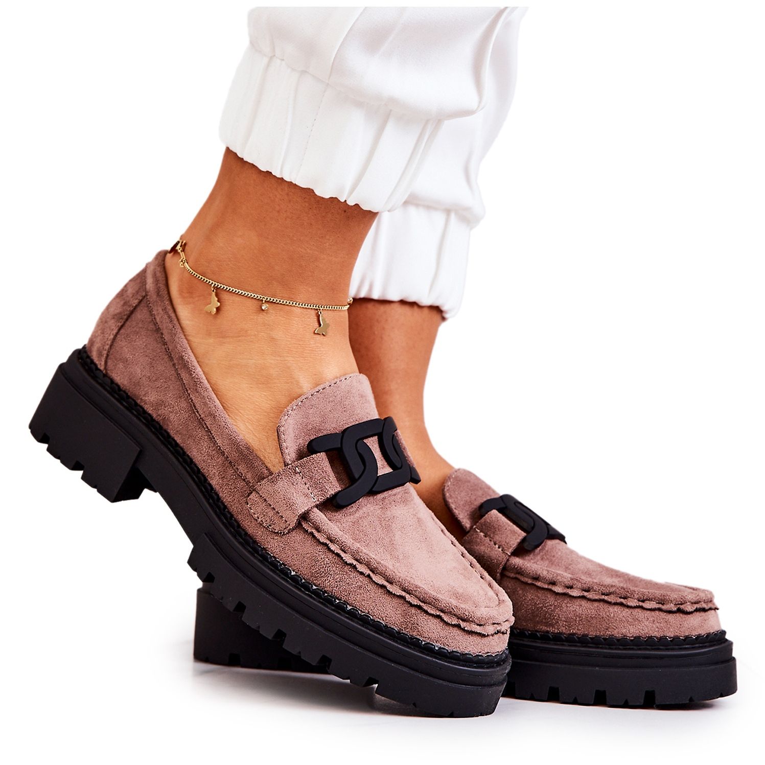 A decoração exclusiva da corrente acrescenta personalidade, tornando cada passo nestes mocassins um verdadeiro atrativo. A palmilha em couro macio garante conforto mesmo em uso prolongado, e a sola trapper de 2,5 cm de espessura garante estabilidade a cada passo.