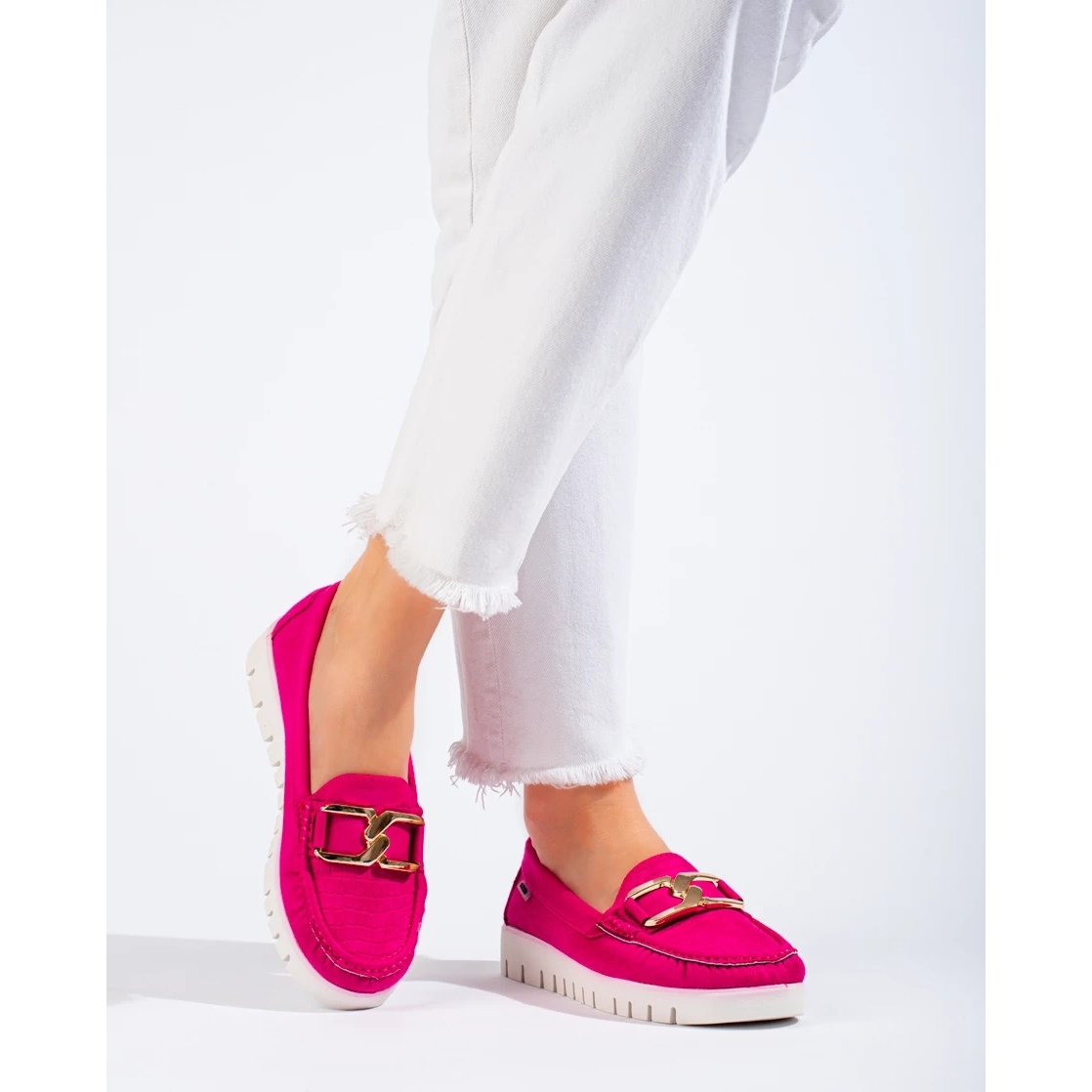 Mocassins de camurça em uma sola grossa de bosques - fúcsia (rosa) com uma corrente