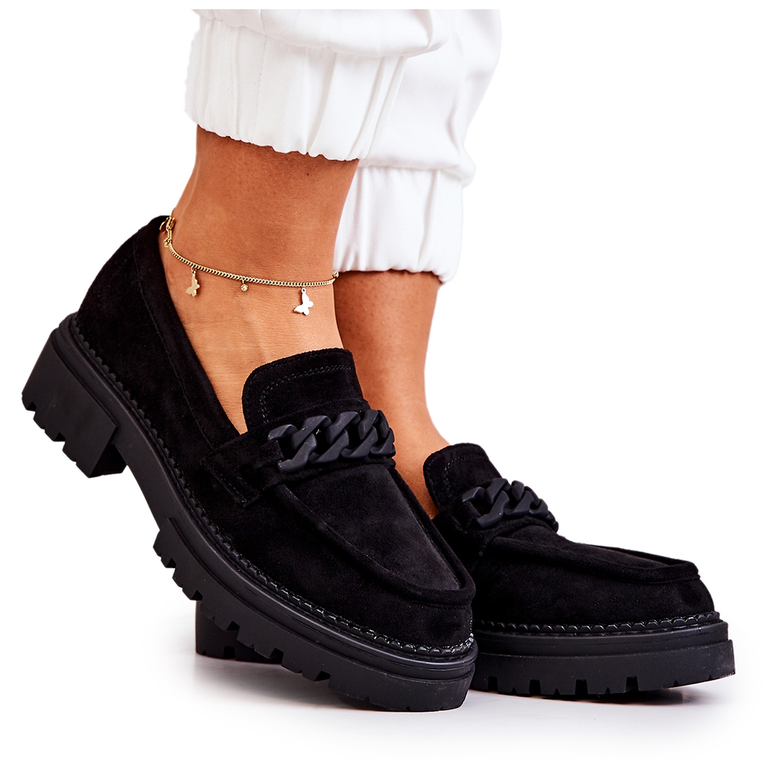 Uma vantagem adicional é a impressionante decoração em forma de corrente, que lhes confere um carácter único, permitindo criar muitos estilos encantadores tanto para trabalho como para reuniões sociais. Graças à sola alta e ao salto de 4 cm, estes sapatos não só alongam o corpo, mas também proporcionam um apoio estável ao caminhar.